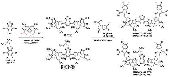 Recently, the direct arylation coupling between CPDT carboxaldehyde (37) and electron-deficient benzo-2,1,3-thiadiozole (BT) and BTA derivatives (40, 41, and 42) was carried out to prepare the intermediates of non-fused ring acceptors SMA22–SMA25, as shown in Figure 9 [48,49]. In the presence of Pd2dba3/L1, PivOH, and cesium carbonate (Cs2CO3) in ODMB, the dialdehyde intermediates 43, 44, and 45 were produced in good yields of 73%, 72%, and 70%, respectively. Then, the dialdehyde compounds were subject to Knoevenagel condensation with 1,1-dicyanomethylene-3-indanone (46) and its dichloride (47) to obtain the acceptors SMA22–SMA25 in yield of 83% to 90%. The photovoltaic properties of the acceptors were evaluated in solar cells by employing PBDB-T, PBDB-T-2Cl, and PM6 as the electron donors. The PCE of OSCs based on PBDB-T/SMA22 and PBDB-T-2Cl/SMA22 was 9.3% and 2.8%, respectively. In contrast, OSCs based on PBDB-T/SMA23 and PBDB-T-2Cl/SMA23 achieved high PCE of 10.2% and 10.5%, respectively. Moreover, the OSCs based on PM6/SMA24 and PM6/SMA25 exhibited PCE of 8.50% and 10.56%, respectively.