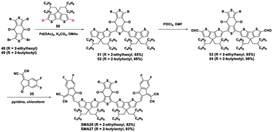 Similar non-fused ring acceptors SMA26 and SMA27 were prepared using benzodithiophenedione (BDD) core with 2-ethylhexyl or 2-butyloctyl side chains, respectively (Figure 10) [50]. Firstly, Pd(OAc)2-catalyzed direct arylation coupling was performed between BDD dibromides 48 or 49 and CPDT compound 50 to obtain intermediate products 51 and 52 with yields of around 65%. Subsequently, formyl groups were introduced by the Vilsmeier-Haack reaction at the α-position of the thiophene unit in the trimer intermediates to obtain the aldehyde-functionalized 53 and 54 in high yields. Finally, the target SMA25 and SMA26 were produced by Knoevenagel condensation with good yields of 82% and 83%, respectively. Using PM6 as the electron donor, the OSCs based on SMA26 afforded a high PCE of 12.59% with an excellent Jsc of 22.57 mA cm−2, a Voc of 0.88 V, and an FF of 63.38%. In comparison, the counterpart devices based on SMA27 showed a lower PCE of 9.80%, with Jsc of 19.09 mA cm−2, Voc of 0.87 V, and FF of 58.36%.