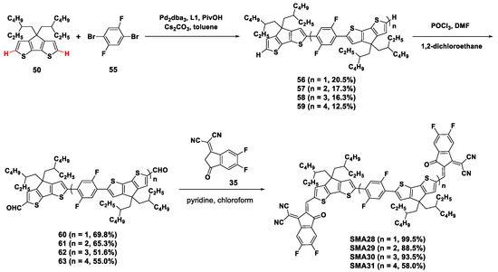In addition, SMAs consisting of oligomeric cores were designed and synthesized via the one-pot direct arylation reaction, as shown in Figure 11 and Figure 12 [51,52]. CPDT compound 50 reacted with 1,4-dibromo-2,5-difluorobenzene (55) in the presence of Pd2dba3, L1, Cs2CO3, and PivOH in toluene, to obtain the oligomers [51]. With the molar ratio of 1.6:1, 56–59 were obtained in the yield of 20.5%, 17.3%, 16.3%, and 12.5%, respectively. Through the Vilsmeier-Haack reaction and Knoevenagel condensation, the acceptors SMA28–SMA31 were produced in reasonable yields (Figure 11). Subsequently, PBDB-T was used as the donor to evaluate the photovoltaic properties of the acceptors. With an extension of the oligomer linker, PCE of the corresponding OSCs firstly increased from 6.31% (SMA28) to 9.32% (SMA29), then gradually decreased to 5.71% (SMA30) and 2.76% (SMA31). Moreover, the Jsc and FF values of the devices showed the same tendency. While benefiting from the progressively promoted LUMO energy levels, the devices’ Voc values ascended from 0.77 V to 0.90 V, along with the growth of the linker lengths.