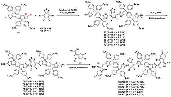 The oligomers 55–57 and 68–70, with stepwise chain lengths increasing, were obtained by one-pot direct arylation coupling between IDT (18) and BT dibromide (40) or its fluoride analog (64) with the molar ratio of 2:1 [52]. After formylation, the dialdehyde intermediates reacted with electron-deficient end unit 35 to produce the target A-Linker-A type acceptors SMA32–SMA37 (Figure 12). The photovoltaic performance of these acceptors was evaluated by the OSCs cooperating with PM6 as the donor to investigate the influence of the π-conjugation length of the oligomeric cores. The PCE of the solar cells was 10.27% and 12.08%, for SMA32- and SMA35-based OSCs, respectively. Longer linkers sharply decreased the PCE of the acceptors to below 5% (i.e., 1.09%, 0.23%, 4.75%, and 1.43% for SMA33, SMA34, SMA36, and SMA37, respectively). This result indicated that an overlong linker weakened the D–A electron interactions and decreased the driving force for charge transfer, thus degrading the photovoltaic property of the corresponding acceptors. Increasing the feed ratio is an effective means of suppressing the formation of a higher molecular weight oligomer to improve the yield of the trimer [29]. Increasing the feed ratio of 18 to 40 (or 64) to 3:1, the reaction yields of the trimer 65 and 68 were improved to about 60% [52]. With a larger feed ratio of 10:1, the reaction yields of the crude trimers reached 83%. These results demonstrated that the oligomer distributions in this type of direct arylation could be facilely tailored by tuning the feeding ratio to obtain the target products.