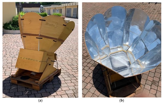 In recent decades the need for renewable energy has become a compelling ecological demand that affects all human activities []. Recently, in the food and agriculture industry, solar energy has been used as energy supply to lower the costs, to dry foods (solar dryer) or applied to waste transformations [,,]. The use of solar cookers was initially developed to help the population during calamities or to diminish the people’s need of wood or charcoal for water sterilization and food preparation [,]. Recently, the new ecological sensitivity of modern society has led some people to extend the use of solar cookers in natural environments, such as camping areas or outdoor excursions. The simplest models of solar cookers use cardboard parabolic reflectors to focalize the sun rays on a covered black pot, generally put inside a plastic bag to insulate. The heat introduced permits cooking at medium temperature (65–150 °C) and the food is generally stewed in water, sauce, or oil.