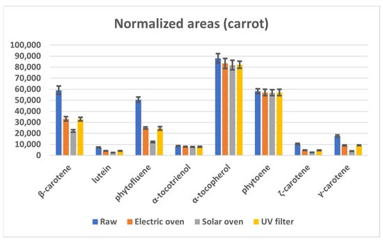 Mean chromatographic areas normalized for the weight of the sample, obtained from the HPLC-MS analyses of raw carrot samples (blue series) and after cooking by electric oven (orange series), solar oven (grey series), and solar oven with UV filter (yellow series).