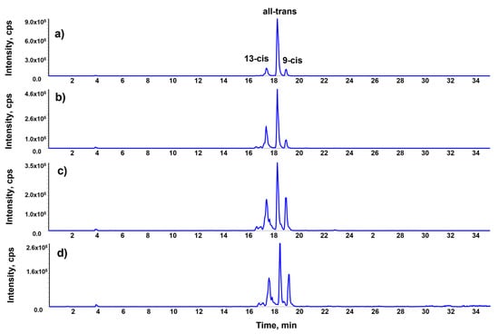 Fat-soluble vitamins and carotenoids are a large family of essential micronutrients having a variety of functions crucial for the human organism. The fat-soluble vitamins (A, D, E and K), are present as a large number of homologues, called vitamers. Vitamers have a different bioavailability, biological potency, and physiological role [,]. The elucidation of food vitamers and carotenoids composition is a challenging task because of their instability under light, oxygen, and pH extremes. Other analytical difficulties lie in separating a large number of compounds and in distinguishing structural and geometrical isomers. Currently, most methods have only dealt with the analysis of one or few major forms of vitamins and carotenoids. Procedures like these might lead to oversimplified results because the natural distribution of the minor, but not less important vitamin and carotenoid forms, remains unrevealed. This could prevent finding a correlation with nutritional properties of foods []. For this reason, in this research, HPLC, coupled with diode array (DAD) and mass spectrometry detection (MS), was used to increase sensitivity, selectivity, and identifiability of vitamins and carotenoids.