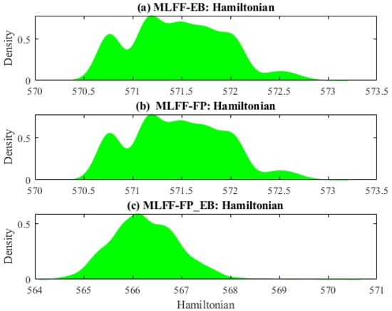 Distribution of Hamiltonian energy: (a) MLFF-EB, (b) MLFF-FP, and (c) MLFF-FP_EB.