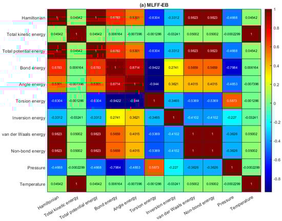 Figure 2a–c depicts the pairwise correlation coefficients between the multivariate data of antiviral drugs on the BP monolayer, MLFF-EB, MLFF-FP, and MLFF-FP_EB, respectively. As the calculation proceeds, there is no change in the temperature profile. This suggests that the model is dynamically stable. We observe that the temperature is absolutely correlated with kinetic energy. Once more, the temperature is uncorrelated with the other variables since it is related to the variations of the potential energy, non-bond energy, and total energy, respectively. Furthermore, it is also observed that in the Hamiltonian, potential energy, kinetic energy, non-bond energy, and total energy are constant throughout the simulation processes. We found a lowering in the kinetic energy that leads to general stability. However, this indicates that the model used in this study shows additional thermal stability of the system. The relaxed geometries are further used for creating a black phosphorus sheet for loading antiviral molecules that characterize the drug-BP based nanocarrier. Accordingly, the optimized ML structures (MLFF-EB, MLFF-FP, and MLFF-FP_EB, at T = 0 K) are in good agreement with the interaction energies and van der Waals energies found by means of DFT calculations [45]. For more information, please see Tables S1 and S2, respectively. Finally, during the calculations, the entire cell with its external pressure was fixed, and it had a moderate correlation with respect to bonding energy, angle energy, and TPE, as depicted in Figure 2.