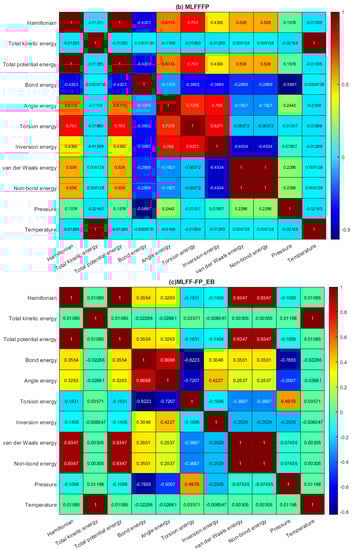 Heatmap of the correlation matrix: (a) MLFF-EB, (b) MLFF-FP, and (c) MLFF-FP_EB.