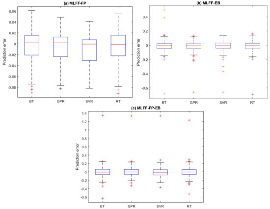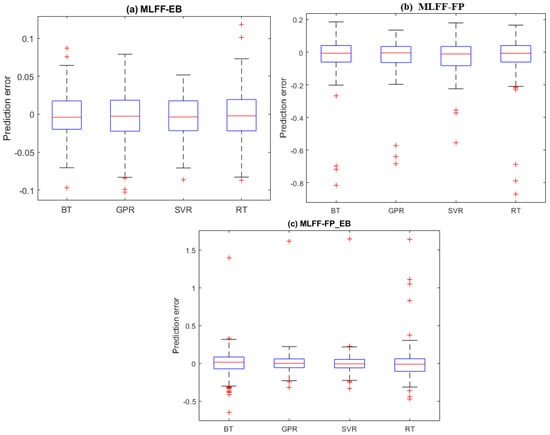 Figure 5a–c shows the boxplots of the prediction errors for the four models based on testing datasets (MLFF-EB, MLFF-FP, and MLFF-FP_EB). Visually, we observe that the boxplots are around zero, which means that the prediction quality is good and the prediction errors are small. Additionally, it can be seen that the GPR model provides relatively slightly less prediction errors than the other models for the three considered datasets.