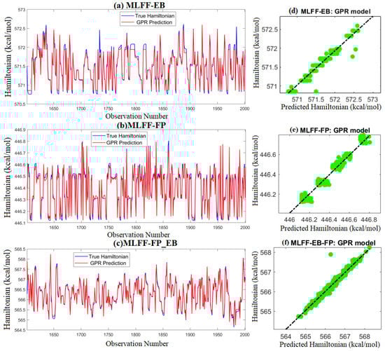 As a visual illustration, the scatter graphs and plots of actual and predicted Hamiltonian energy of MLFF-EB, MLFF-FP, and MLFF-FP_EB, when applying the trained GPR model to testing data are depicted in Figure 4. To simplify visual readability, we presented only the results from the best model, and the results from the other models were omitted. We observe that the predicted values of Hamiltonian energy obtained by the GPR models are fairly close to the actual data of MLFF-EB, MLFF-FP, and MLFF-FP_EB, which indicates the promising performance of the GPR model.