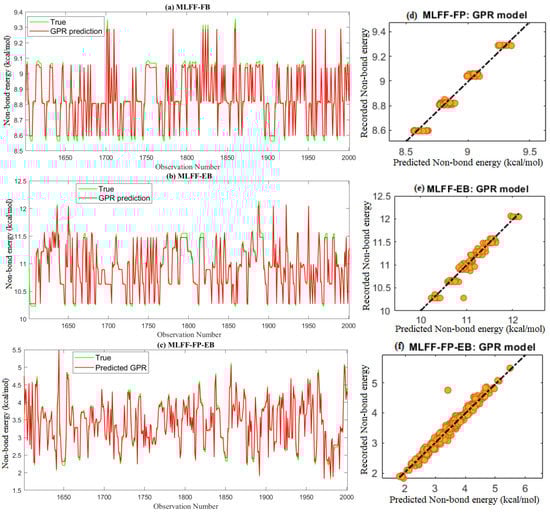 The actual MD results and the predicted non-bond energy from the four models based on testing datasets are depicted in Figure 6a–c. We found that the predicted values of non-bond energy from the GPR model closely followed the measured data. Figure 6d–f shows the scatter plot of the measured and predicted values of non-bond energy from the GPR model. A scatter plot is a useful tool to visually compare a dataset’s predicted and measured data. In Figure 6d–f, the colored dots represent the data points, where the x-axis represents the predicted values and the y-axis represents the measured non-bond energy values. If the dots are closely clustered around the diagonal line, the model performs well and makes accurate predictions. Thus, from Figure 6d–f, we observe that the predictions are close to the measured values.