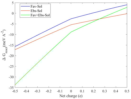 The calculated adsorption energy process as a function of net charge at the solvent phase of the BP sheet with favipiravir, ebselen, and favipiravir + ebselen hybrid drugs. The minus red and plus blue sign colors represent the difference between pH < 0 and pH > 0 values, respectively.