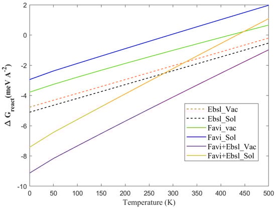 The free Gibbs adsorption energy process as a function of temperature at the vacuum and solvent phases of the BP sheet with favipiravir, ebselen, and favipiravir+ebselen hybrid drugs.