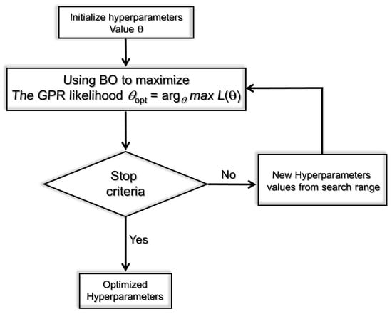 This study adopts Bayesian optimization to find the optimal values of GPR’s hyperparameters [63]. Recently, the BO approach has been frequently employed to fine-tune hyperparameters in machine learning methods. This could be attributed to its design using Gaussian processes and Bayesian inference to reach global optimization [60]. Importantly, the BO procedure considers the previous evaluations to determine the hyperparameter set and then evaluates the next step, which enables reducing the time of the optimization procedure [64]. Moreover, the BO procedure can optimize functions without closed form [65]. The optimization process based on the BO procedure needs fewer iterations compared to a grid search optimization.