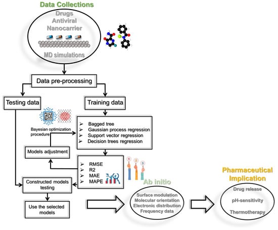 In recent years, the application of machine learning techniques in nanomaterials and pharmaceutical technologies has gained significant attention from researchers. Several studies have used backpropagated neural networks to model various systems [39,40], including Darcy–Forchheimer slip flow models for nanomaterials and ferrofluids [41], non-Fourier heat flux models for transient heat exchange [42], and ternary nanofluid flow between parallel plates [43]. The accuracy of these models was evaluated using reference datasets obtained via the Homotopy Analysis Method and numerical methods. The effects of non-dimensional parameters on the systems were also analyzed. In this paper, by utilizing accelerated molecular dynamics, machine learning, and quantum chemicals based on first-principles density functional theory (DFT), we briefly report the structural stability and thermochemical properties of FP and EB functionalized within a typical phosphorene 2D monolayer. The chemical bonding of FP and EB in 2D black-phosphorus materials is revealed by considering the vacuum and continuum solvent model. However, by calculating the Gibbs free energy changes of each step, we demonstrated that the temperature and pH values would be used to tune the releasing ratio of the antiviral molecules onto the phosphorene sheet. Our results provide new fundamental insights into exploring innovative 2D materials as new nanocarriers for antiviral drug therapy. These atomistic findings open the door to the parametrization of multiscale methodologies, such as contemporary machine learning based on electronic theories, continuum models, Monte Carlo simulations, and coarse-grained methods, to address the interplay between the interaction of drugs/2D monolayers with the cell membrane as a function of their morphology. In addition, we rigorously explored the efficiency of four machine learning models to accelerate the prediction of Hamiltonian and non-bond energy from EB, FP, and FP-EB, namely Bagged Trees, Gaussian Process Regression (GPR), Support Vector Regression (SVR), and Regression Trees (RT). The reason for considering multiple models is to compare and evaluate their performance in accurately predicting the behavior of the antiviral molecules in the 2D monolayer. We calibrated the machine learning models using Bayesian optimization based on the training data. Results revealed the superior performance of the GPR model by reaching an averaged of 0.9649. Training efficient and accurate models for approximating DFT is the final step in using machine learning to gain more insight into the design of new drugs.