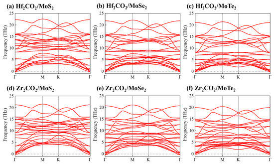The phonon dispersion curves of (a) Hf2CO2/MoS2, (b) Hf2CO2/MoSe2, (c) Hf2CO2/MoTe2, (d) Zr2CO2/MoS2, (e) Zr2CO2/MoSe2, and (f) Zr2CO2/MoTe2 heterostructures.