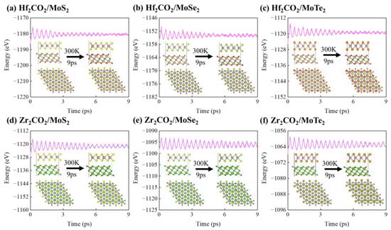 The evolutions of total energy and structure snapshots from AIMD simulations of (a) Hf2CO2/MoS2, (b) Hf2CO2/MoSe2, (c) Hf2CO2/MoTe2, (d) Zr2CO2/MoS2, (e) Zr2CO2/MoSe2, and (f) Zr2CO2/MoTe2 heterostructures.