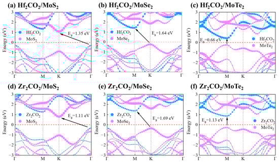 The projected band structures of (a) Hf2CO2/MoS2, (b) Hf2CO2/MoSe2, (c) Hf2CO2/MoTe2, (d) Zr2CO2/MoS2, (e) Zr2CO2/MoSe2 and (f) Zr2CO2/MoTe2 heterostructures using HSE06 functional. The Fermi energy level is set to zero.
