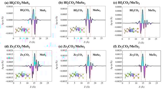 The 3D iso-surfaces and plane-averaged charge density differences along the z-direction for: (a) Hf2CO2/MoS2, (b) Hf2CO2/MoSe2, (c) Hf2CO2/MoTe2, (d) Zr2CO2/MoS2, (e) Zr2CO2/MoSe2, and (f) Zr2CO2/MoTe2 heterostructures. The depletion and accumulation of electrons are represented by magenta and blue contours, respectively.