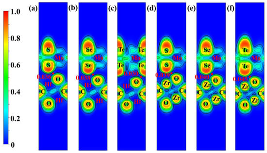 ELF contour plots projected on the (110) plane of (a) Hf2CO2/MoS2, (b) Hf2CO2/MoSe2, (c) Hf2CO2/MoTe2, (d) Zr2CO2/MoS2, (e) Zr2CO2/MoSe2 and (f) Zr2CO2/MoTe2 heterostructures.
