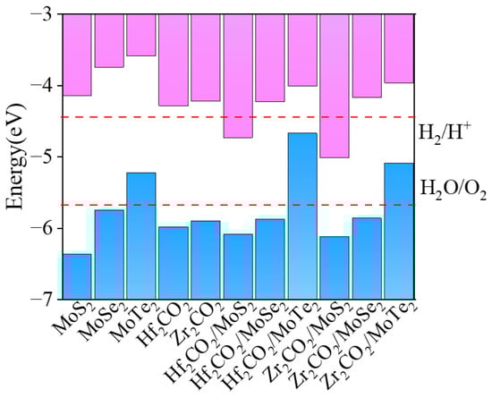To understand the chemical driving force for the water-splitting reaction, the band edge alignments of the M2CO2, MoX2 monolayers, and M2CO2/MoX2 heterostructures in conjunction with the work functions were investigated, as shown in Figure 7. The energy levels of the VBM and CBM of the MoS2, MoSe2, Hf2CO2, and Zr2CO2 monolayers satisfy the requirements of the redox potential of water splitting. However, the VBM of the MoTe2 monolayer is higher than the oxidation-reduction potential. The result agrees well with the previous report [60]. Herein, the work functions for MoS2, MoSe2, MoTe2, Zr2CO2, and Hf2CO2 monolayers are 5.68, 5.06, 4.60, 5.23, and 5.17 eV, respectively. The disparity in the work function across monolayers contributes to the electron transfer in the vdW heterostructures until the Fermi energy level reaches equilibrium, which is beneficial to form built-in electric fields. Herein, Hf2CO2/MoSe2 and Zr2CO2/MoSe2 heterostructures with suitable band edge alignments for water oxidations and reductions, render them effective photocatalysts for overall water splitting.