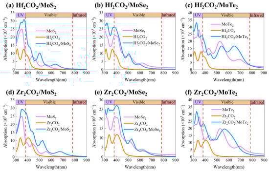 The absorption coefficient of (a) Hf2CO2/MoS2, (b) Hf2CO2/MoSe2, (c) Hf2CO2/MoTe2, (d) Zr2CO2/MoS2, (e) Zr2CO2/MoSe2, and (f) Zr2CO2/MoTe2 heterostructures together with the pristine monolayers using HSE06 functional.