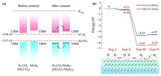 (a) The schematic illustrations of the charge transfer paths and overall water splitting of Zr2CO2/MoSe2 (Hf2CO2/MoSe2) heterostructure. (b) The generation processes of hydrogen on the Zr2CO2 (Hf2CO2) surface of Zr2CO2/MoSe2 (Hf2CO2/MoSe2) heterostructure.