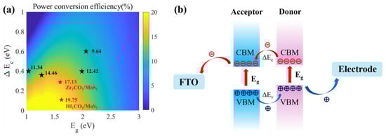 (a) A simulated PCE map refers to the donor band gap and conduction band offset of M2CO2/MoX2 heterostructures. (b) Schematic illustration of free charge carrier transfer path in M2CO2/MoX2 heterostructure solar cells.