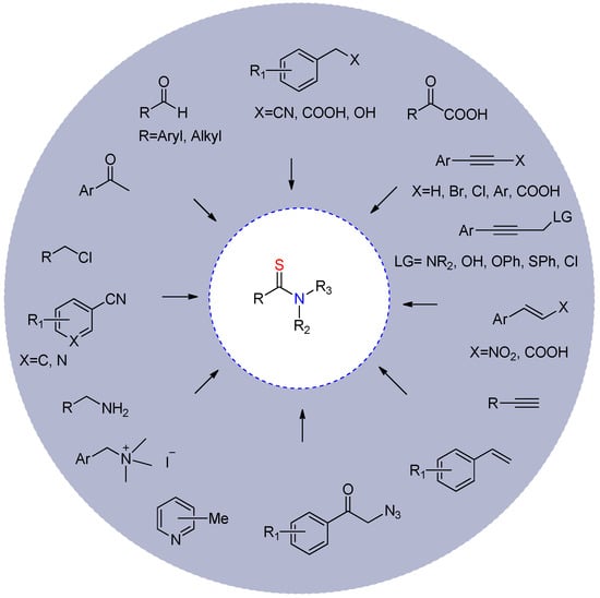 Thioamide compounds have therefore attracted considerable attention from organic chemists, and recent years have been rich in reported novel protocols looking for better practicality, efficiency, or environmentally friendliness. A wide range of starting materials have been employed to construct thioamides, including aldehydes, alkynes, alkenes, amines, benzyl halides, phenyl acetonitrile, cinnamic acids, α-azido ketones, and several others, as depicted in Figure 2.