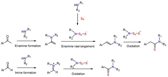 Elemental sulfur (S8) has been extensively utilized for O-S exchange reactions or C-S bond formations, which can play the roles of reagent, oxidant, reducing agent, or catalyst depending on the specific process. The typical Willgerodt–Kindler reaction involves the oxidation/rearrangement of a ketone by using elemental sulfur and primary or secondary amines, leading to the thioamide linkage. When aldehydes are used as the carbonyl substrate instead of ketones, the reaction does not involve the rearrangement step (Figure 3).