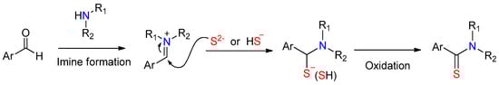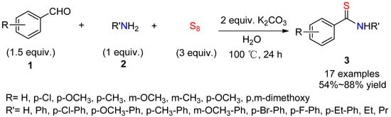 A three-component synthesis of aromatic thioamides 3 was established in a one-pot procedure, which involved substituted benzaldehydes 1, primary amines 2, and elemental sulfur (Scheme 1) [23]. The reaction is performed under catalyst-free and no-organic-solvent conditions, providing thus a range of desired aryl-substituted thioamides in a very practical way.