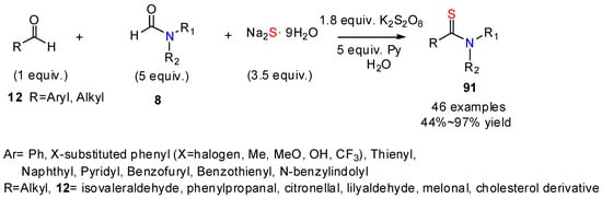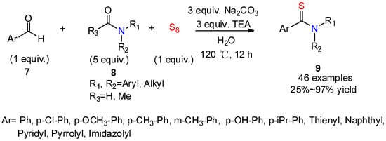 This protocol is extendable to other amides. For example, Yuan’s group [25] recently reported a thioamidation reaction using various amides as amine sources in water (Scheme 3). Screening different organic bases, inorganic bases, or their mixtures, they found the combination of sodium carbonate and triethylamine afforded the desired aryl thioamides 9 in a high yield. Their study of the scope of formamides and aryl aldehydes demonstrated that the method was compatible with many functional groups, including halides and heteroaromatic rings. Interestingly, this protocol avoided the use of an excess of N-substituted formamide or acetamide.