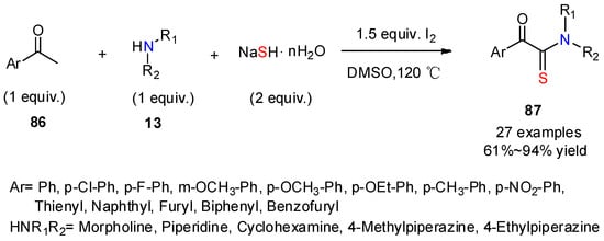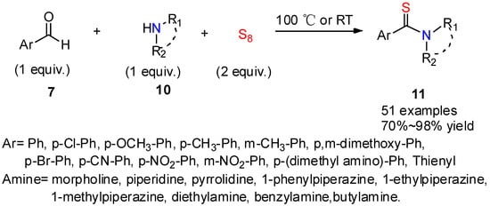 A catalyst-free and solvent-free Willgerodt–Kindler reaction was developed by Dalal’s team to prepare aryl thioamides 11 in good yields (Scheme 4). The reaction was performed at 100 ℃ using cyclic secondary amines including pyrrolidine, piperidine, and morpholine [26]. Some acyclic amines were also explored, such as diethylamine, which led to the corresponding aryl thioamides in good-to-excellent yields at room temperature. This method is remarkable for its clean reaction conditions which avoid the use of organic solvent and catalyst.