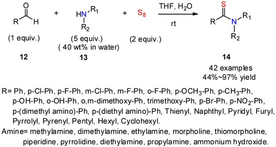 A catalyst-free protocol using alkyl or aryl aldehydes toward thioamides 14 was reported by Gururaja’s group (Scheme 5) [27]. The reaction can proceed in water with small amounts of THF, in the absence of any catalysts, additives, or metal oxides, and with excellent functional group compatibility. Control experiments revealed that water plays an essential role by bringing the reactive substrates into the aqueous medium where the intermediate polysulfide can form. Several examples of biologically active molecules such as thionicotinamide exhibiting anticancer activity have been obtained using this mild protocol.