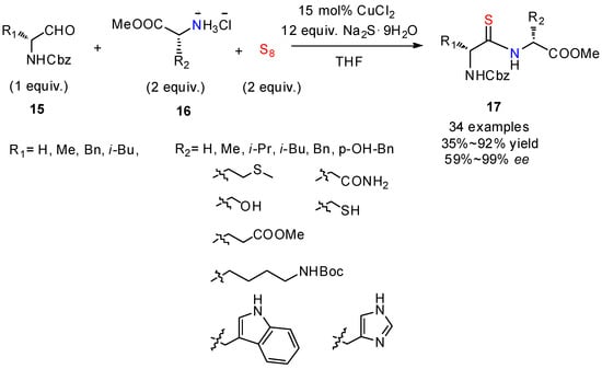 The formation of thioamide peptides 17 by reaction of amino acids with amino aldehydes in the presence of S8 and sodium sulfide has been systematically explored by Jiang and co-workers (Scheme 6) [28]. The presence of copper II chloride appeared essential to the reaction by forming a N-Cu-N chelate fixing the imine, thus preventing racemization. A family of thioamide-containing analogs of dipeptides were prepared with high enantiomeric purity. A 15 mol% amount of CuCl2 was identified as the optimal catalyst amount to provide the desired products in good yields and with high enantioselectivity. This method provides a direct strategy for the synthesis of thioamide-containing peptides with chirality retention, and was efficiently applied to targets of pharmaceutical interest. Here, the presence of the catalyst is essential for preserving the chirality of the substrate into the product.