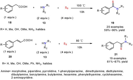 Decarboxylative reactions being a powerful strategy to construct the C-N bond, Singh’s group [29] reported a novel route towards benzothioamides 19 or 2-phenylethanethioamides 21 (Scheme 7). The reaction of aryl acetic or cinnamic acids with amines and elemental sulfur led to the formation of thioamides in the absence of any catalyst or solvent. The structural scope included various substituted arylacetic and cinnamic acids found to efficiently provide the target thioamides in good yields. In the case of nitro substituted substrates, the nitro group was reduced into an NH2 group that remained in the final product. This method, which proceeds without the use of catalyst or external oxidants, extended the scope of the Willgerodt–Kindler reaction to carboxylic acids, which are readily available starting materials.