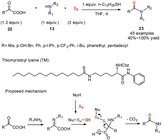 In 2020, Takemoto’s group [30] described a facile and site-selective approach to access thioamides using a α-keto carboxylic acid, amine, and sulfur via the nucleophilic addition of thiols to elemental sulfur (Scheme 8). The decarboxylative thioamidation between α-keto carboxylic acids 22 and amines 13 furnished the aryl/alkyl thioamides 23 in good yields. The reaction exhibited broad functional group tolerance, including unprotected alcohols, carboxylic acids, phenols, and unsaturated bonds. Examples of applications of the method included biologically active compounds such as thiomyristoyl lysine, possessing anticancer properties. The key to this approach is the activation of elemental sulfur by thiols.