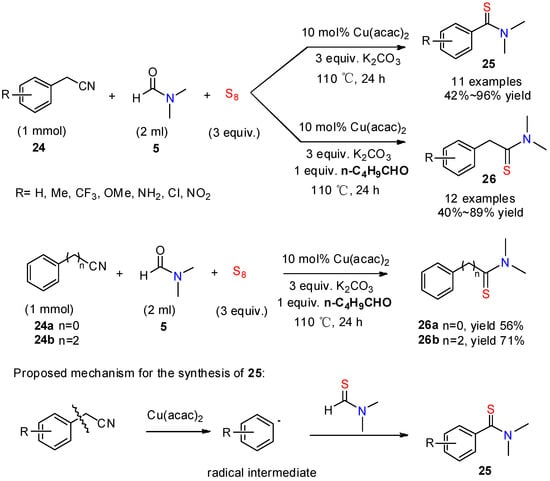 Copper-mediated selective thionylation of phenylacetonitrile with sulfur and dimethylformamide (DMF) was realized by Zhou’s group [31] to provide N,N-dimethylthiobenzamides 25 (Scheme 9). The exploration of the mechanism showed that the reaction proceeded via the formation of a benzene radical intermediate generated from Cu-catalyzed C-C bond cleavage of phenylacetonitrile and N,N-dimethyl sulfide amide generated from the reaction of elemental sulfur and DMF. When the reaction was performed in the presence of n-pentanal, N,N-dimethyl-2-phenylethanethioamides 26 were obtained (Scheme 9). Though the role of the aldehyde remained unclear, its ability to prevent the formation of benzene radicals was hypothesized. This method requires the presence of the copper catalyst to transform the initial phenylacetonitrile into the radical species.