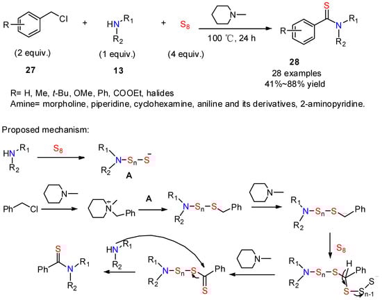 Benzyl chlorides can also lead to benzothioamides, thanks to a three-component reaction with amines and elemental sulfur, such as in the synthetic route established by Han and co-workers [32]. Under the optimized conditions, the reaction generated the desired benzothioamides 28 in yields up to 88% (Scheme 10). The scope of the reaction was investigated using a variety of amines and substituents on the aromatic ring of benzyl chloride. This is a very practical transformation which exhibits good functional group tolerance, and proceeds in a one-pot procedure without the utilization of transition metals or oxidants.