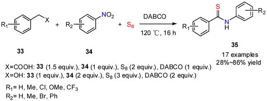 A three-component reaction to access N-phenyl-benzothioamides 35 involving benzyl alcohol or phenylacetic acid, nitroarenes, and elemental sulfur was developed in a one-pot procedure [35]. This method employed 1,4-diazabicyclo[2.2.2]octane (DABCO) as the base which activated the elemental sulfur (Scheme 13). The authors investigated the scope of substitution on the aryl acetic acid and nitroarene moieties, observing a good tolerance with respect to a wide range of functional groups. The extension of the reaction to benzyl alcohols is currently explored. Compared with other methods, the benefit of this approach is the use of nitroarenes as stable and readily available substrates.