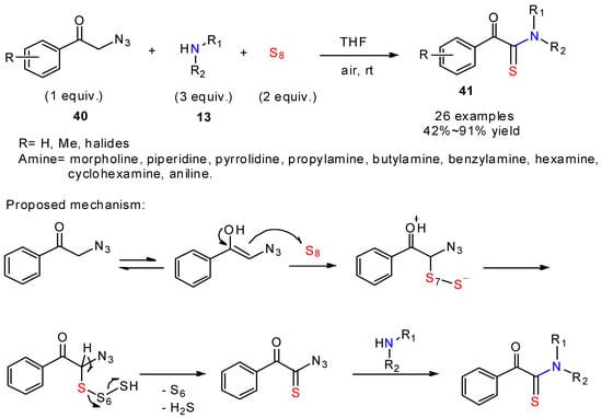 Benefiting from the ability of azides to behave as leaving groups, Chen and his colleagues [37] described a metal-free synthetic approach towards α-ketothioamides 41 from α-azido ketones, amines, and elemental sulfur (Scheme 15). This reaction involving the cleavages of C-N3 displayed a broad substrate scope and high yields under mild conditions. On the basis of a series of control experiments, the authors proposed a plausible reaction mechanism via enol tautomerization, desulfhydrylation, and the departure of the azido group. This work provides a new development of α-azido ketone chemistry, and offers an alternative protocol for the synthesis of α-ketothioamide.