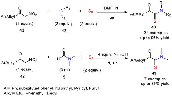 α-Nitroketones are also useful substrates for the preparation of α-keto thioamides. In 2021, Sheng and his colleagues [38] described an efficient protocol for the synthesis of diverse α-keto thioamides 43 from α-nitroketones and amines in the presence of sulfur (Scheme 16). This transformation, which proceeds under mild condition, tolerates a broad range of substitutions, especially for the alkyl α-keto thioamides, which are rarely reported in the literature.
