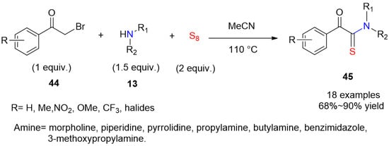 - Nguyen, T.B.; Tran, M.Q.; Ermolenko, L.; Al-Mourabit, A. Three-component reaction between alkynes, elemental sulfur, and aliphatic amines: A general, straightforward, and atom economical approach to thioamides. Org. Lett. 2014, 16, 310–313. [Google Scholar] [CrossRef]