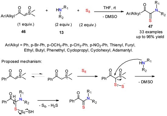 The same year, another access to α-keto thioamides was reported by Pandey’s group, who used sulfoxonium ylides as substrates with primary or secondary amines (Scheme 18) [40]. The reaction, driven by the release of DMSO, provided α-keto thioamides 47 at room temperature in good-to-excellent yields. This work provides an original development of the chemistry of sulfoxonium ylides, which are easy to synthesize and stock usually as stable crystalline solids. Using a ready operational procedure and mild conditions, this reaction leads to the formation of α-keto thioamides without the need of any catalysts or additional base.
