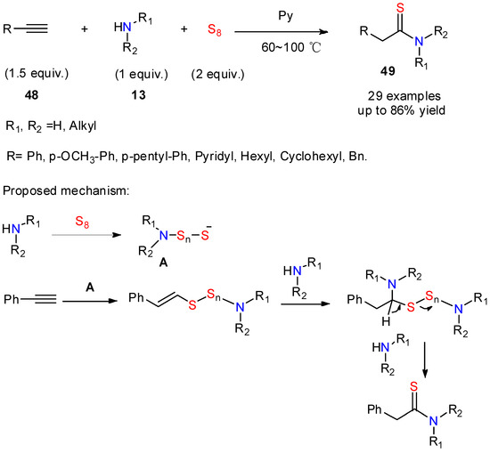Alkenes or alkynes can serve as substrates in thionylation reactions. For example, Nguyen and his colleagues [41] developed a straightforward approach to alkyl thioamides 49 through a three-component reaction from alkynes, aliphatic amines, and elemental sulfur (Scheme 19). The conversion of substrates was accelerated by the presence of pyridine making the reaction mixture more homogeneous. The reaction exhibits a remarkable tolerance for a wide range of functional groups and susbtituents on the alkyne and the alkylamine including cyclic secondary amines. Only aniline remained untransformed under these conditions. Mechanistic investigations led the authors to suggest that the reaction proceeded via the generation of a polysulfide A, its subsequent addition reaction onto the triple bond, then an addition reaction of the amino group onto the double bond, before final elimination of polysulfide. This work shows a remarkable example of atom- and step-economical reaction.