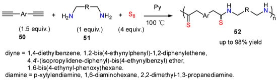 When diynes are used, the strategy can be applied to the preparation of polythioamides, which are interesting sulfur-containing polymers. Tang and his colleagues [42] employed aromatic diynes, elemental sulfur, and aliphatic diamines as monomers to synthesize the polythioamide 52 in high yield through multicomponent polymerization (Scheme 20). The resulting polymer exhibited high molecular weight and well-defined structure.