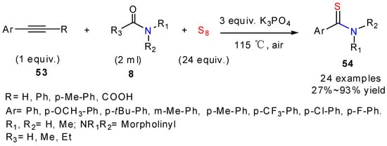In 2018, Liu and co-workers [43] reported the efficient three-component reaction of alkynes, amides, and elemental sulfur, which provided aryl thioamides such as 54 in moderate-to-good yields (Scheme 21). A first advantage of this protocol is to proceed in transition-metal-free conditions. Moreover, the cleavage of the C-C triple bond of aromatic alkynes can be promoted by elemental sulfur without any additional oxidants. This unexpected alkyne cleavage reaction was found to be of high tolerance with respect to the functional group substitution on the aryl alkynes.