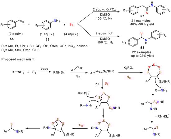 A close example using alkenes was later described by Wu and his colleagues [44], who performed their three-component reaction with amines and sulfur in the presence of KF or K3PO4. Surprisingly, the two bases led chemoselectively to two different kinds of thioamides, the K3PO4-mediated reaction giving the 2-phenylethanethioamides 57 while the KF-mediated reaction provided benzothioamides 58. Though still under investigation, the authors proposed a mechanism supported by control experiments involving the formation of the polysulfide RNHS5K (Scheme 22).