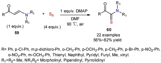 The C=C bond of enaminoketones can also be involved in such a cleavage reaction. This was used by Wan and colleagues, who applied it to the synthesis of α-keto thioamides 60 in moderate-to-good yields by transformation of enaminoketones 59 in the presence of sulfur and DMAP under air (Scheme 23) [45]. This protocol provides an elegant and practical alternative for the construction of α-keto thioamides with broad substrate tolerance from easily available tertiary enaminones. The reaction failed to provide the desired product with N-methyl-N-phenyl tertiary enaminones, giving instead N,N-dimethyl α-keto thioamide, suggesting that DMF competed as an amido/amino source. Control experiments indicated that the cleavage of the C=C bond produced formaldehyde, which was further oxidized to formic acid.