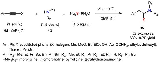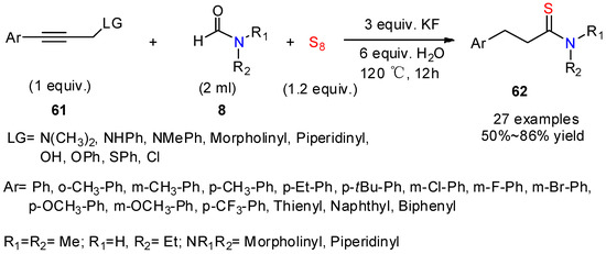 Formamides can also be used in place of amines, such as in the 2020 work reported by Zhang’s group [46] on the three-component reaction of arylpropynes 61, formamides, and elemental sulfur (Scheme 24). The KF-mediated reaction led efficiently to the targeted aryl propanethioamides 62 with wide structural scope. The reaction mechanism was suggested to proceed first via hydrolysis of the C-C triple bond, to form the ketone, and concomitant hydrolysis of formamides, forming the secondary amines, and subsequent formation of the C-N bond and C-S double bond. Aryl propanethioamides 62 could be obtained from internal alkynes by this transformation, indicating that this process shared some similarities with the Willgerodt rearrangement.