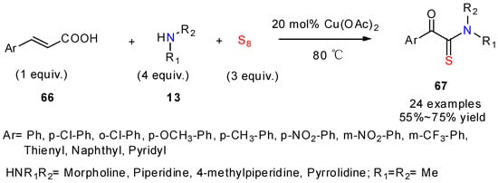 Singh and co-workers reported in 2021 a very straightforward approach to construct α-keto thioamides, starting from readily available cinnamic acids and secondary amines (Scheme 26) relying on a copper-catalyzed decarboxylative thioamidation in the presence of sulfur under neat conditions [48]. α-Keto thioamides 67 were obtained as the final oxidative products in moderate yields. The presence of radical scavengers fully inhibited the formation of final oxidative products, suggesting that the reaction proceeded through a radical mechanism. Different from the one shown in Scheme 7, this reaction of cinnamic acids led to the formation α-keto thioamides. The presence of the copper catalyst is, however, indispensable, as it promotes the oxygenation step.