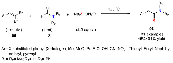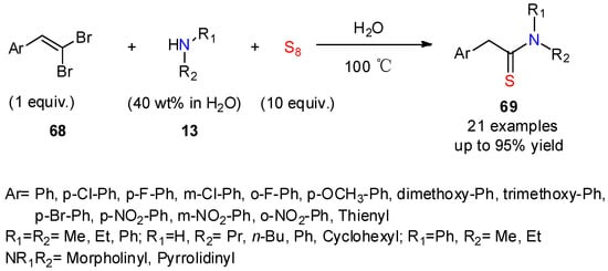 In 2021, Gururaja and co-workers reported the use of gem-dibromostyrenes as substrates in a catalyst-free, three-component reaction in aqueous medium leading to 2-arylethanethioamides 69 (Scheme 27) [49]. As in the case of aldehydes as substrates mentioned earlier (Scheme 5), water is essential for the thioamidation, which could be applied to a variety of aliphatic amines.